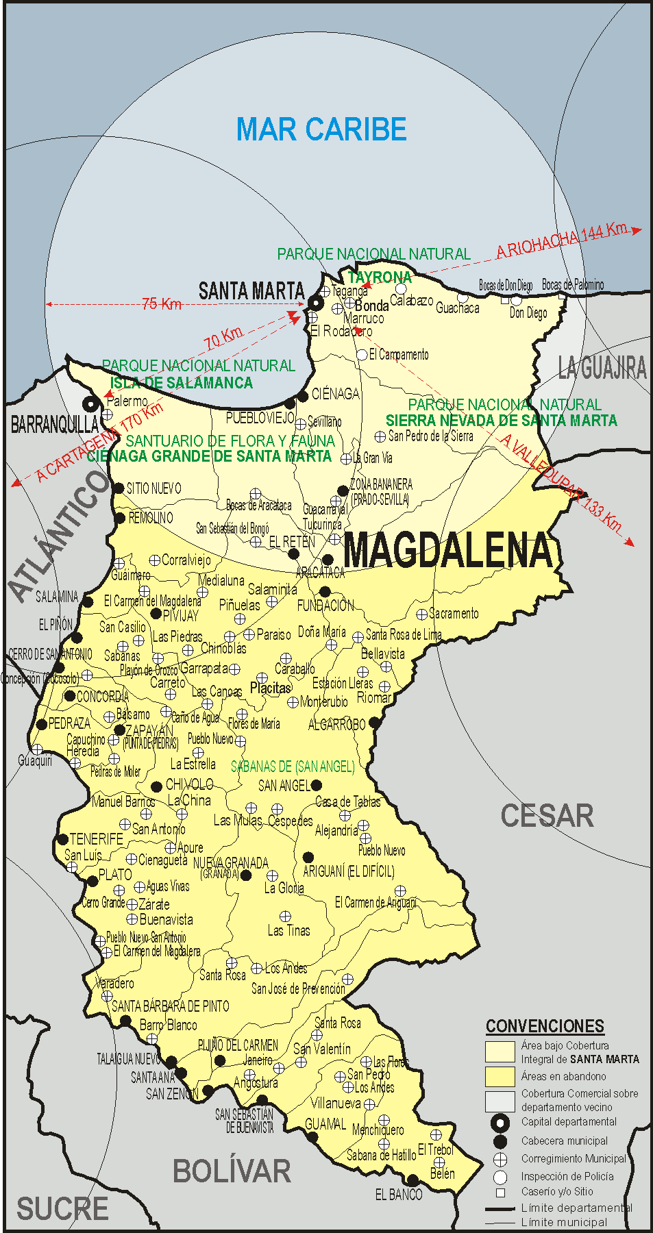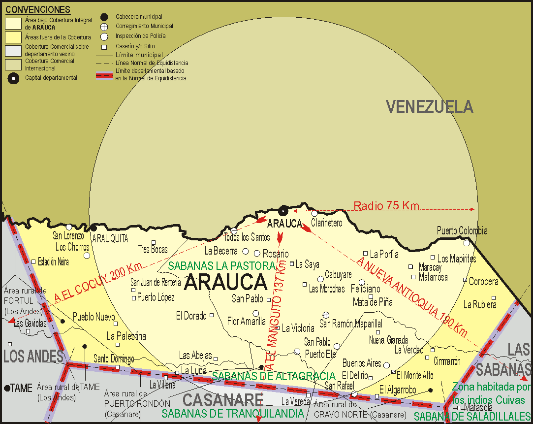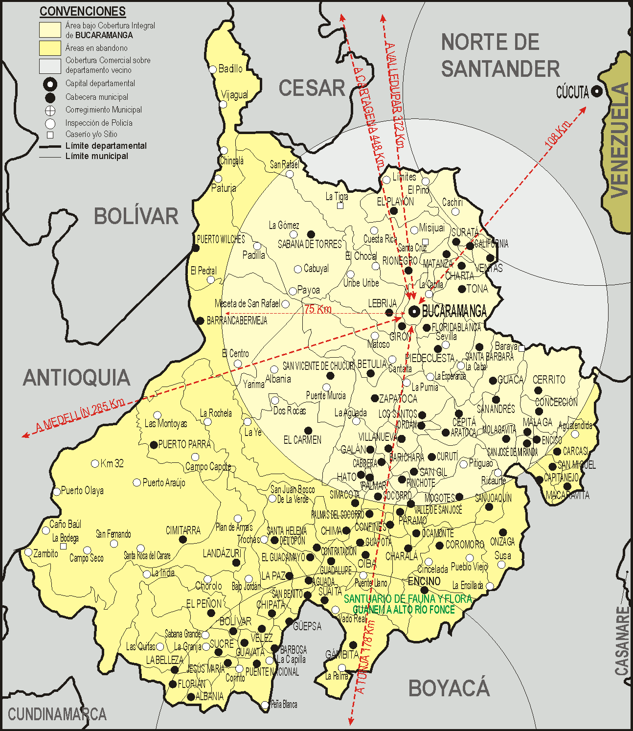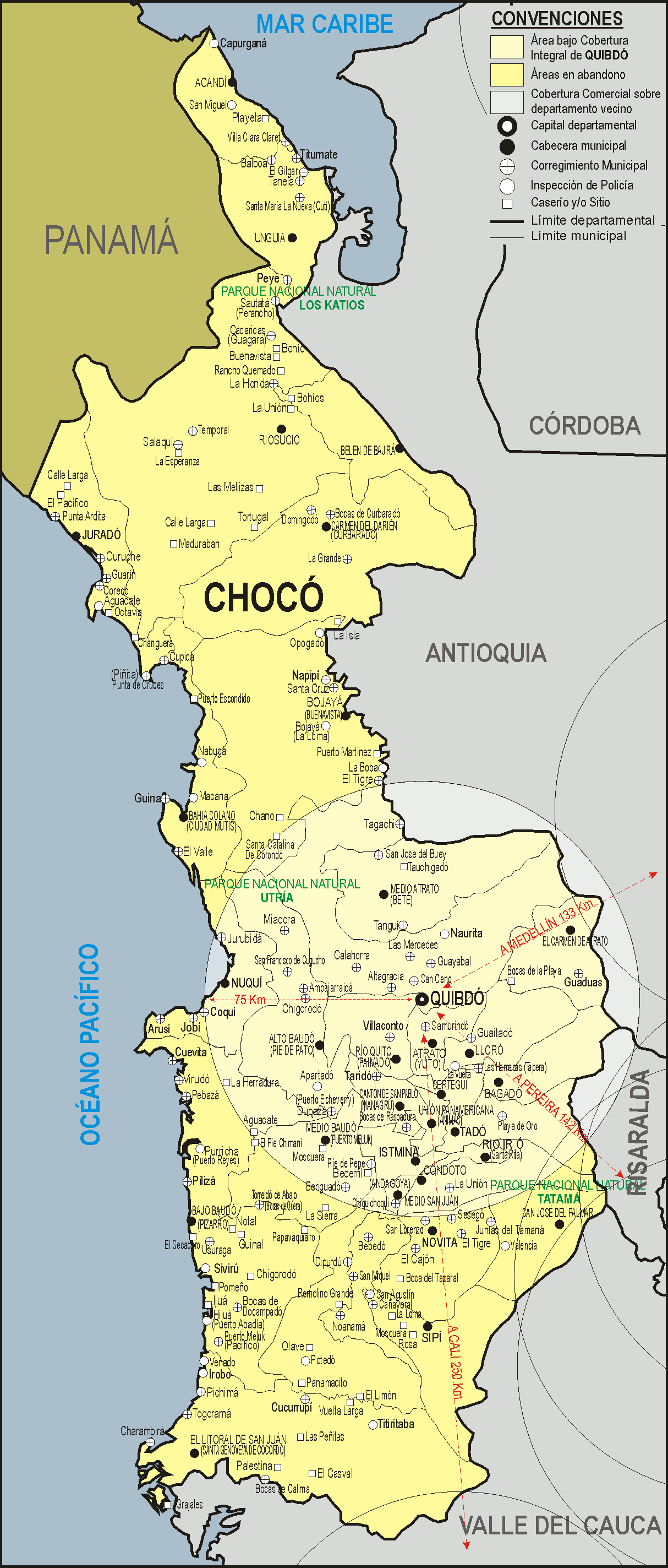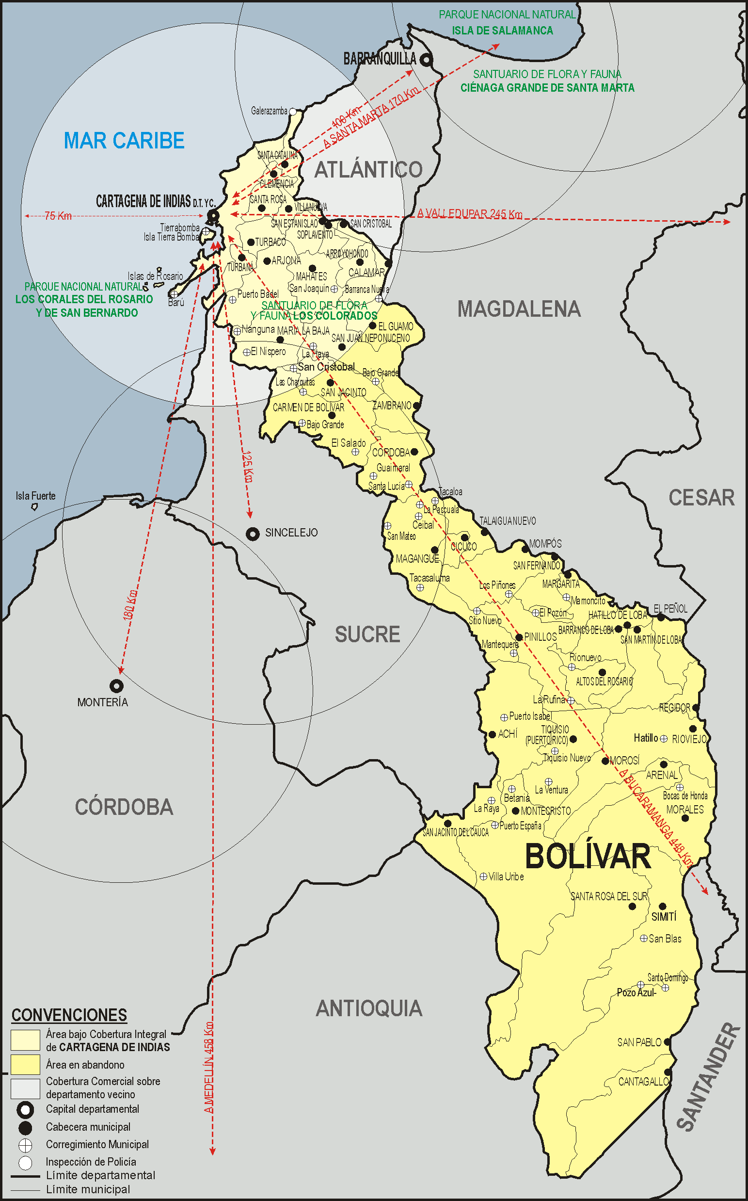 En el campo del estudio de la población se determinaron en 1987 el número de municipios, habitantes y densidad poblacional en cada una de las áreas citadas en el numeral anterior con el fin de medir la influencia que sobre este particular ejerce la ubicación de la capital departamental; y ahora, (2010) también se incluyen los corregimientos departamentales, corregimientos municipales, inspecciones de policía y sitios o caseríos que figuran el MAPA DE ENTIDADES TERRITORIALES editado por el Instituto Geográfico Agustín Codazzi SIGAC en 2006 cuyo esquema puede verse en el Mapa 10. Conjuntos y zonas en abandono. 4 - ESTUDIO DE COBERTURA DE COSTAS En este estudio se determina la extensión de costas bajo cobertura de las capitales y las que permanecen en abandono. 5 - ESTUDIO DE COBERTURA DE FRONTERAS De igual manera que en el estudio anterior se determina la extensión de fronteras bajo cobertura y las abandonadas. |