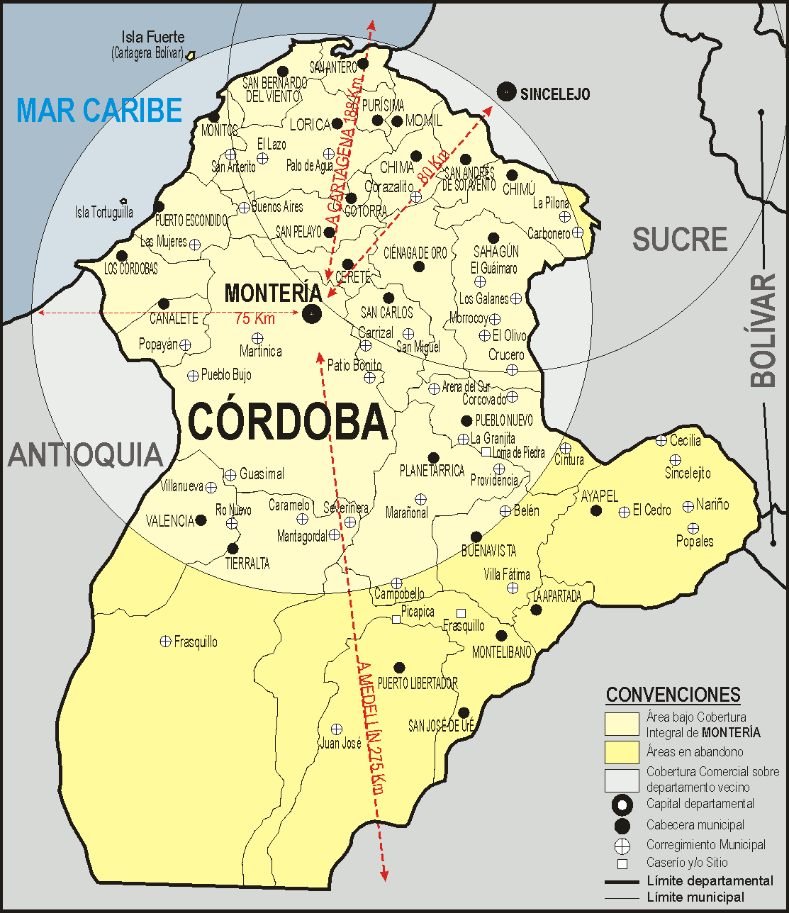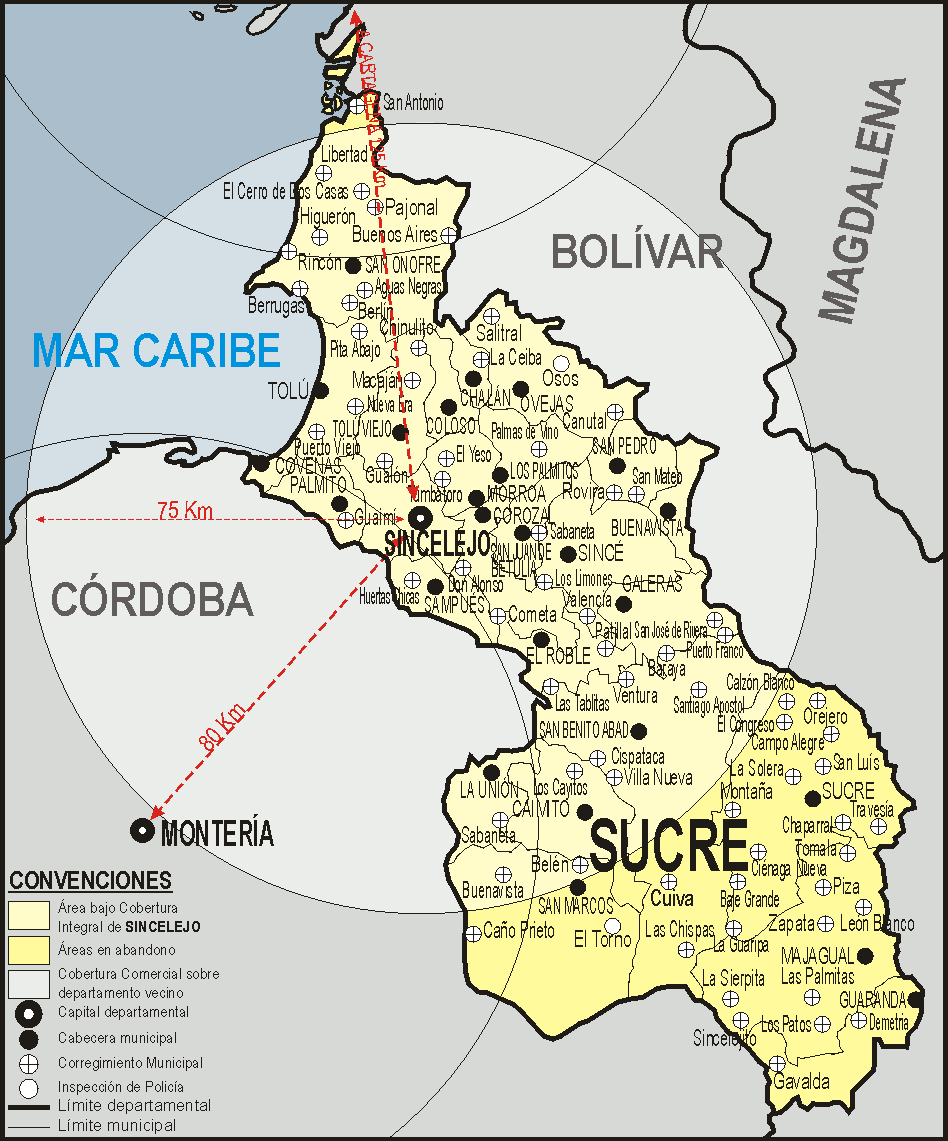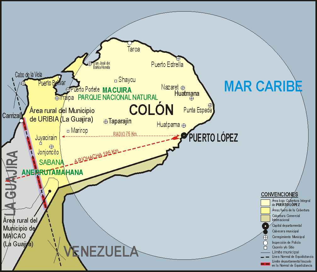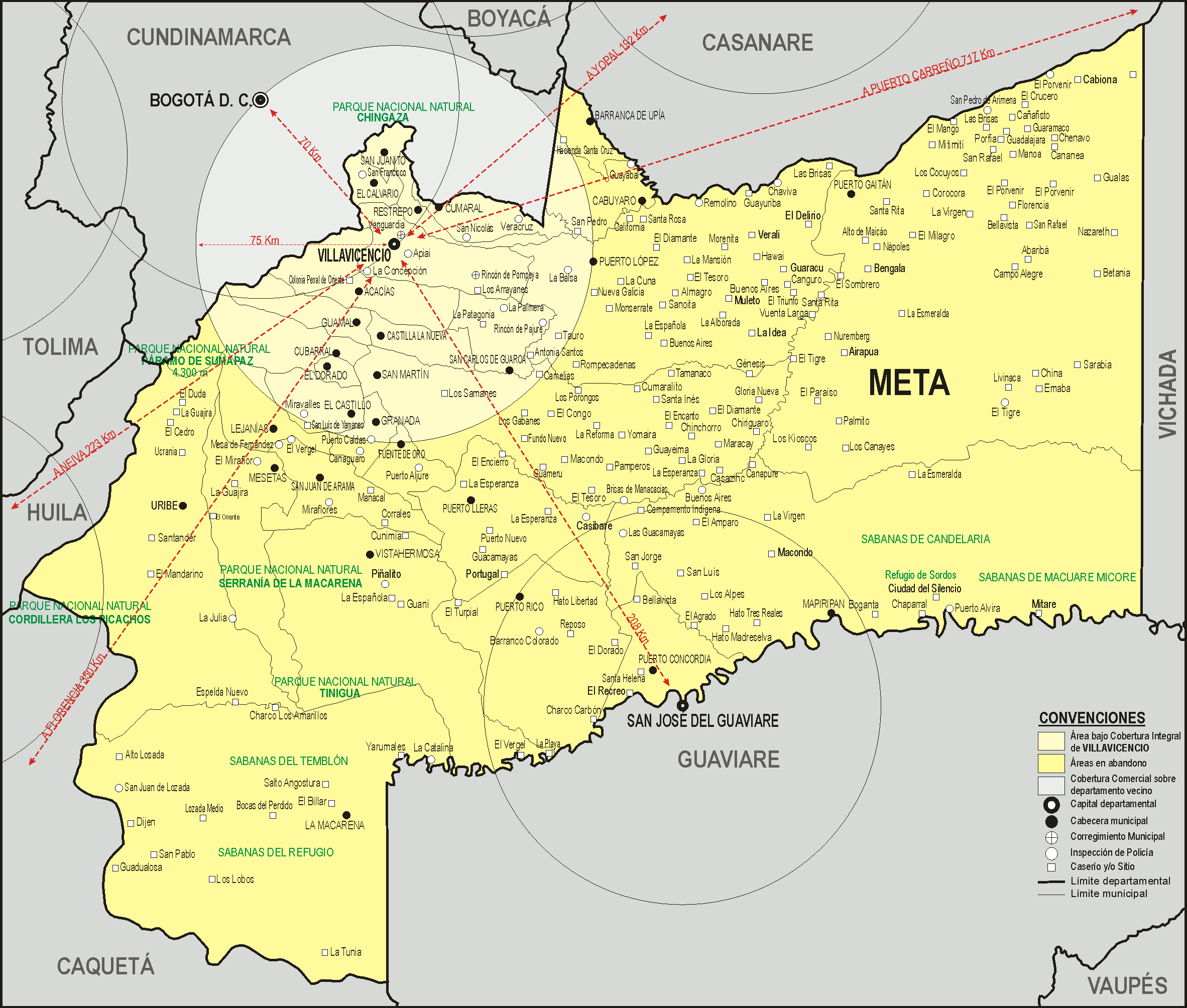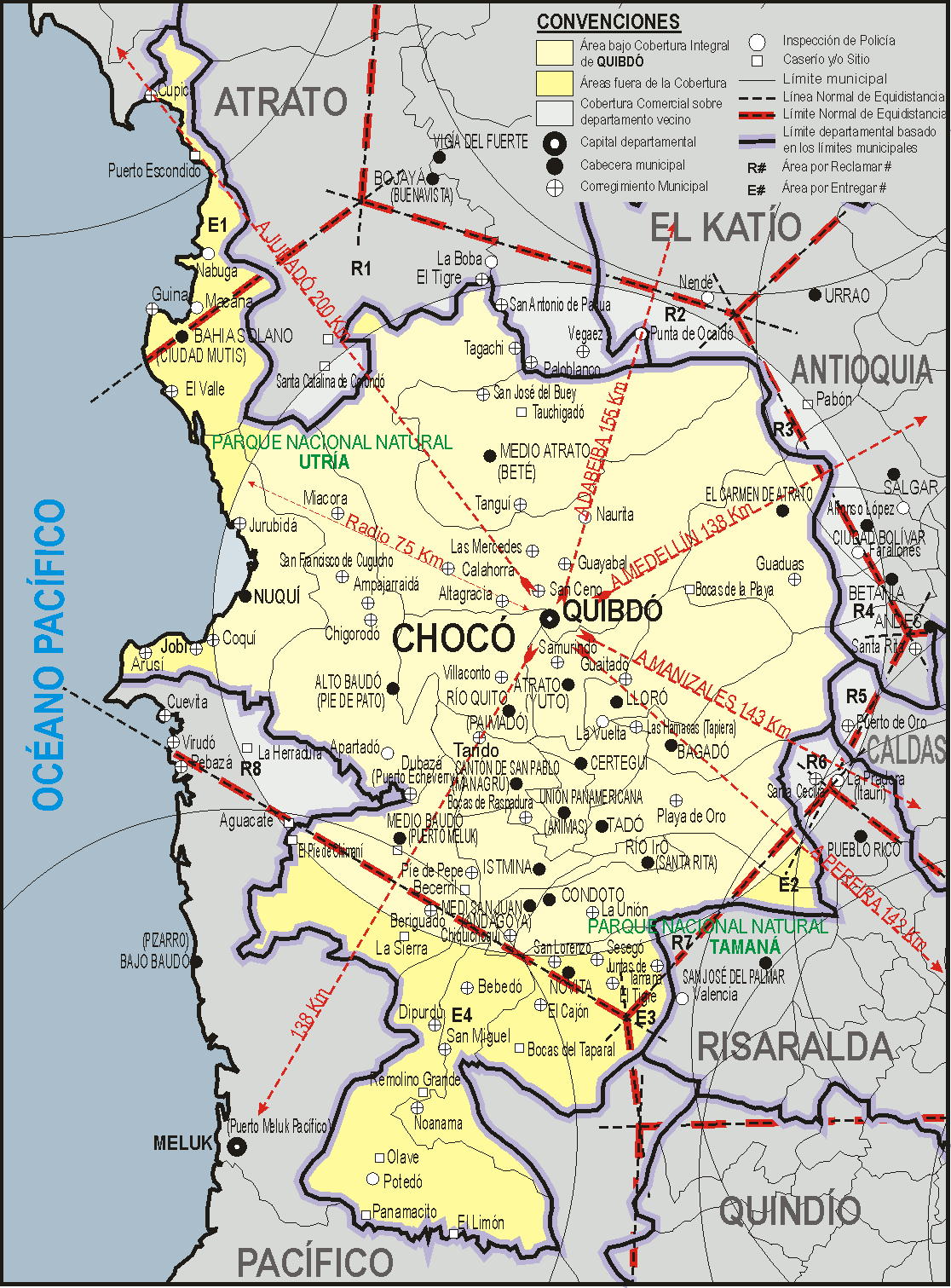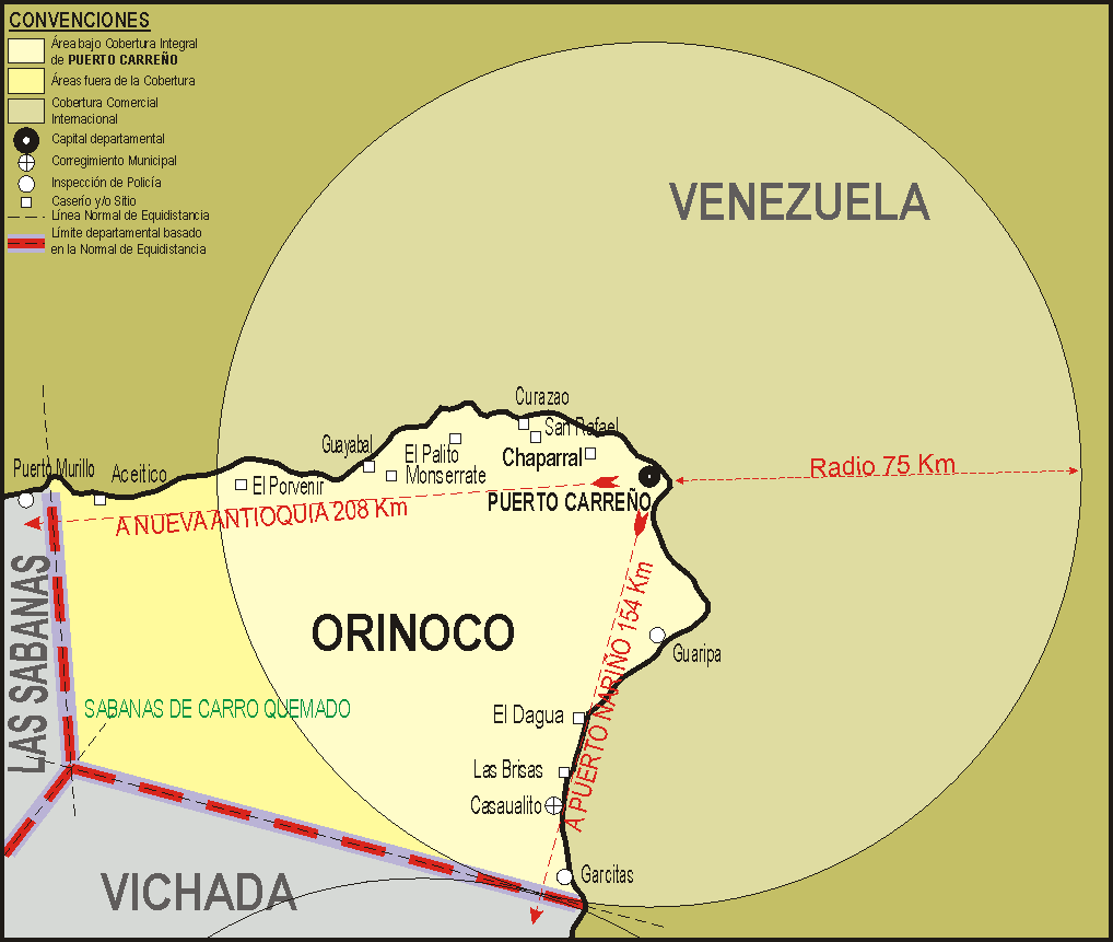 En el campo del estudio de la población se determinaron en 1987 el número de municipios, habitantes y densidad poblacional en cada una de las áreas citadas en el numeral anterior con el fin de medir la influencia que sobre este particular ejerce la ubicación de la capital departamental; y ahora, (2010) también se incluyen los corregimientos departamentales, corregimientos municipales, inspecciones de policía y sitios o caseríos que figuran el MAPA DE ENTIDADES TERRITORIALES editado por el Instituto Geográfico Agustín Codazzi SIGAC en 2006 cuyo esquema puede verse en el Mapa 10. Conjuntos y zonas en abandono. 4 - ESTUDIO DE COBERTURA DE COSTAS En este estudio se determina la extensión de costas bajo cobertura de las capitales y las que permanecen en abandono. 5 - ESTUDIO DE COBERTURA DE FRONTERAS De igual manera que en el estudio anterior se determina la extensión de fronteras bajo cobertura y las abandonadas. |