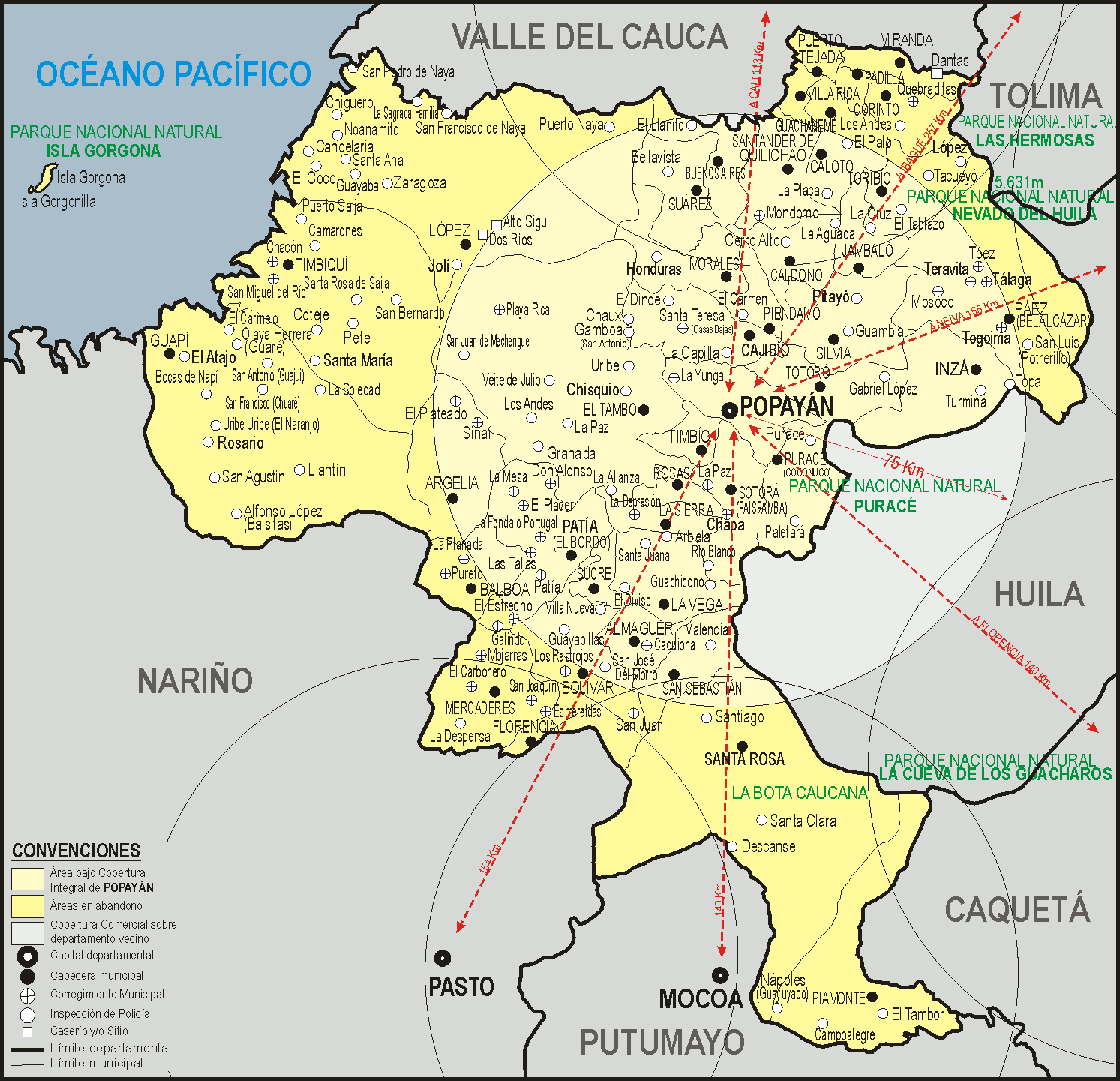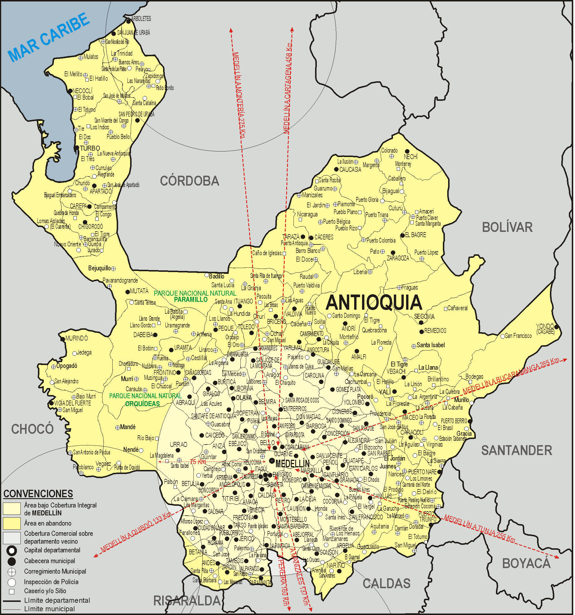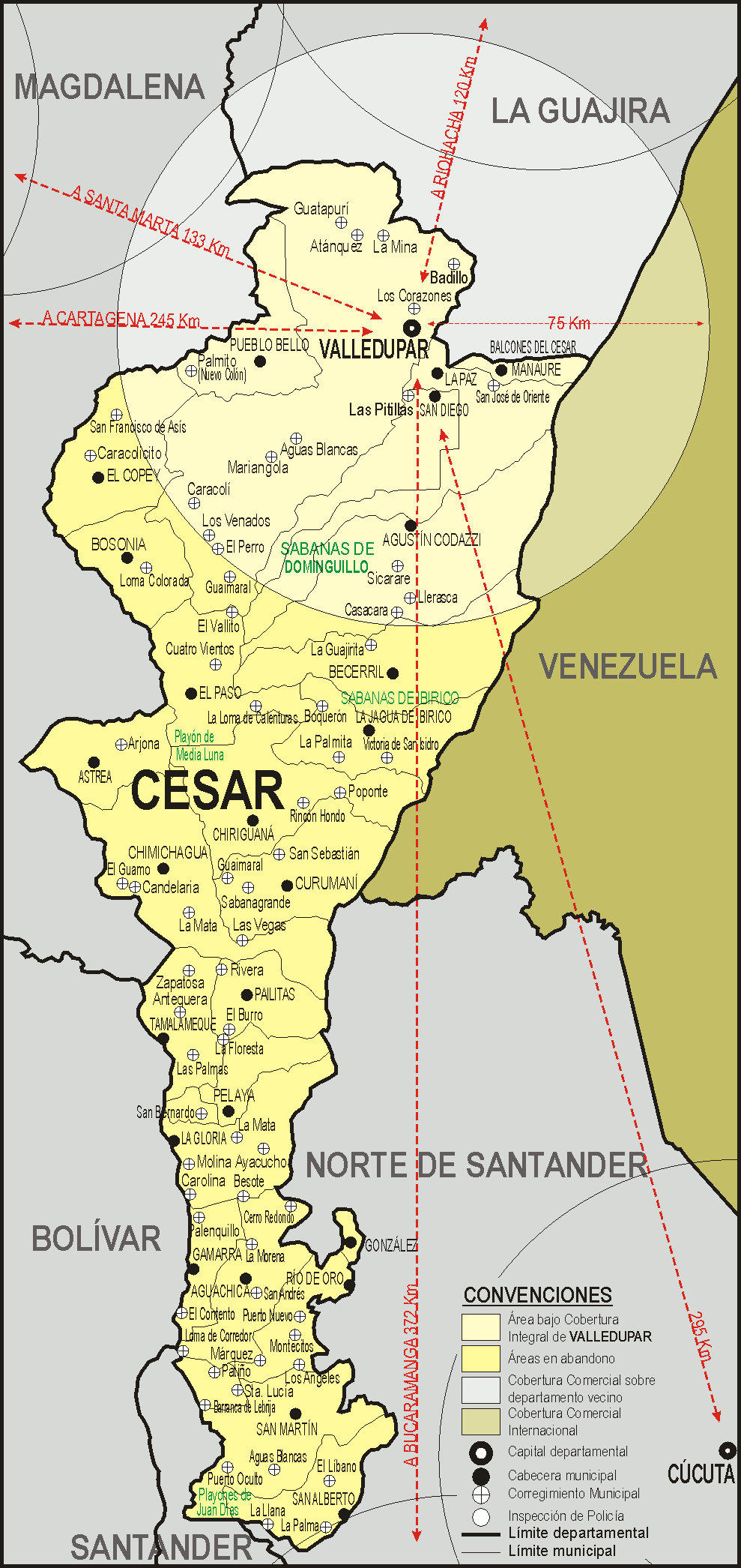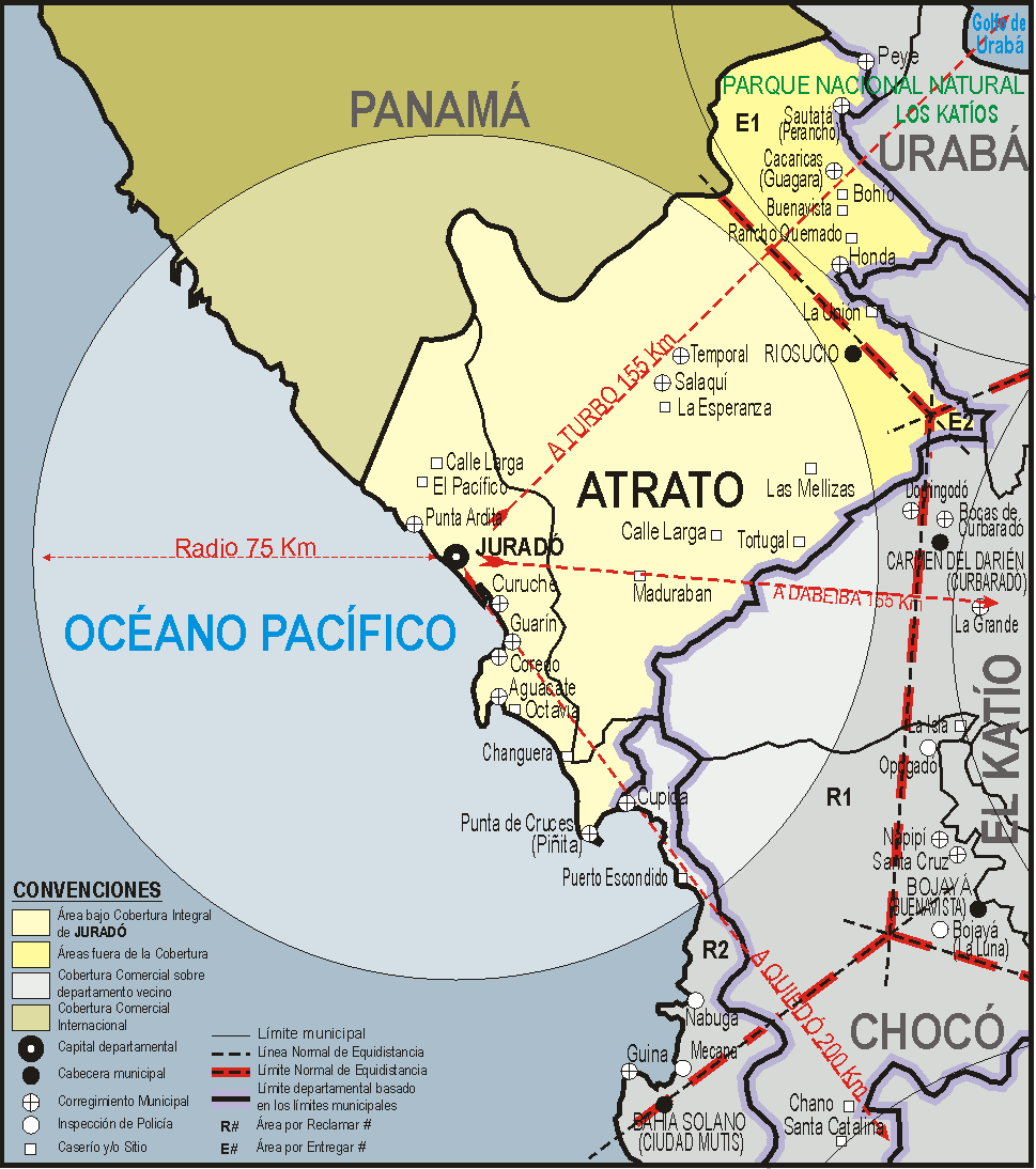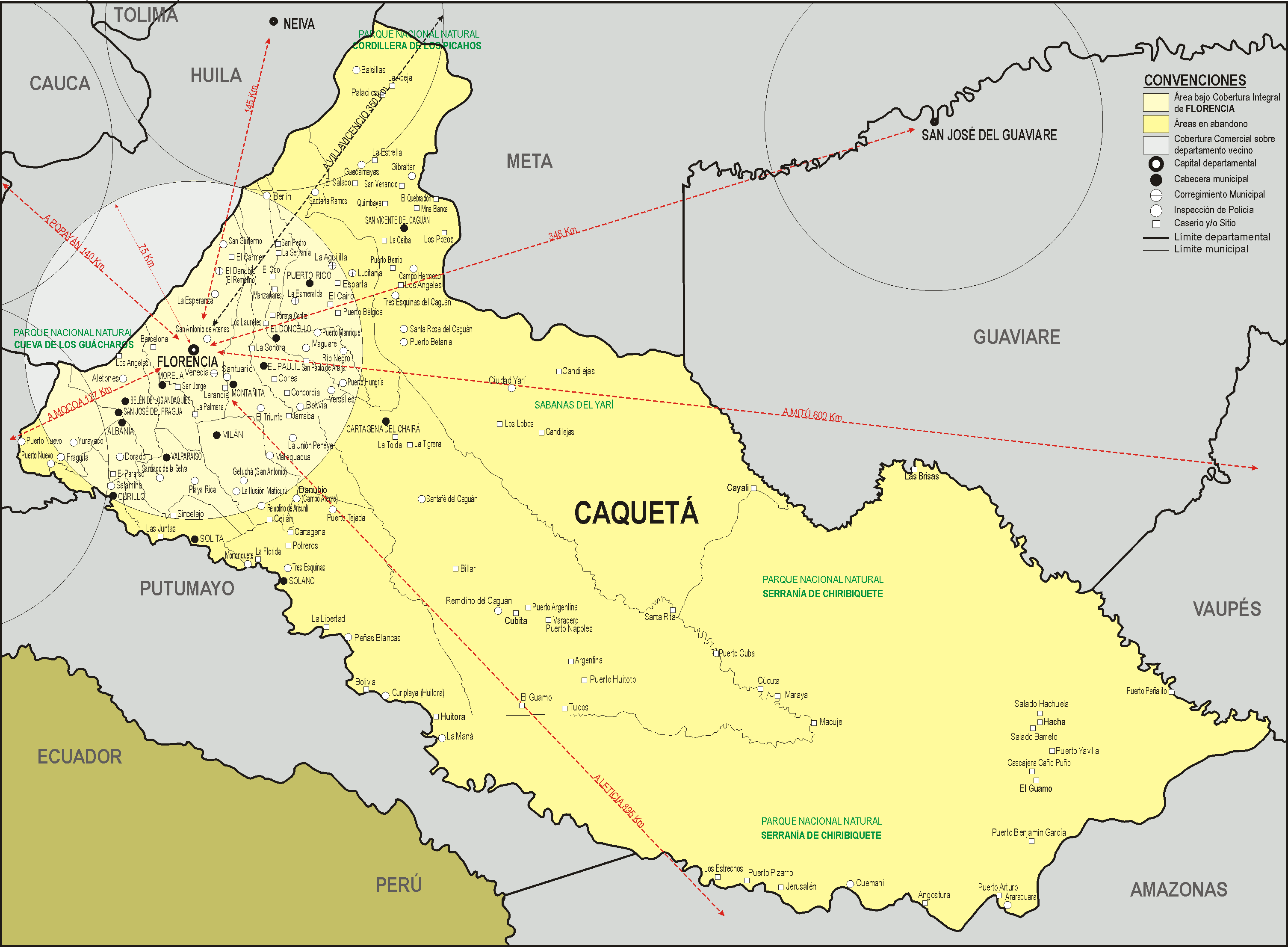 En el campo del estudio de la población se determinaron en 1987 el número de municipios, habitantes y densidad poblacional en cada una de las áreas citadas en el numeral anterior con el fin de medir la influencia que sobre este particular ejerce la ubicación de la capital departamental; y ahora, (2010) también se incluyen los corregimientos departamentales, corregimientos municipales, inspecciones de policía y sitios o caseríos que figuran el MAPA DE ENTIDADES TERRITORIALES editado por el Instituto Geográfico Agustín Codazzi SIGAC en 2006 cuyo esquema puede verse en el Mapa 10. Conjuntos y zonas en abandono. 4 - ESTUDIO DE COBERTURA DE COSTAS En este estudio se determina la extensión de costas bajo cobertura de las capitales y las que permanecen en abandono. 5 - ESTUDIO DE COBERTURA DE FRONTERAS De igual manera que en el estudio anterior se determina la extensión de fronteras bajo cobertura y las abandonadas. |