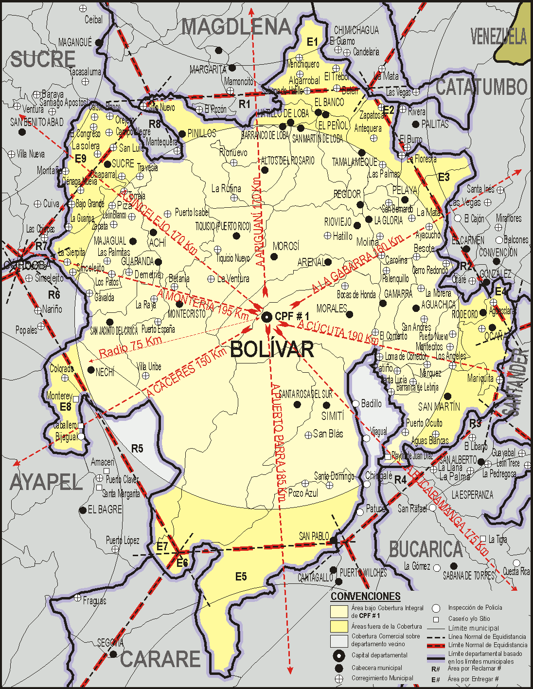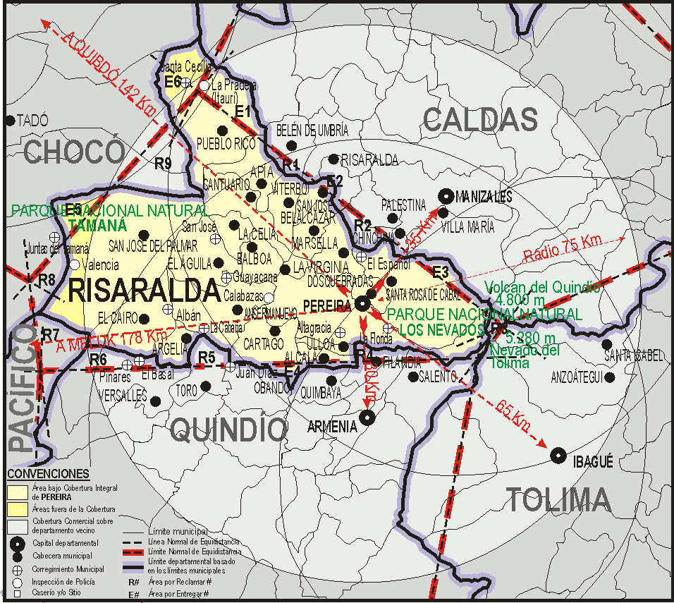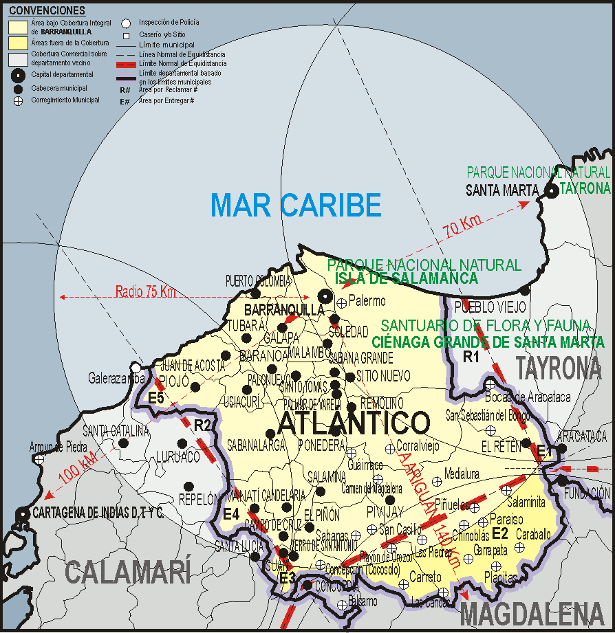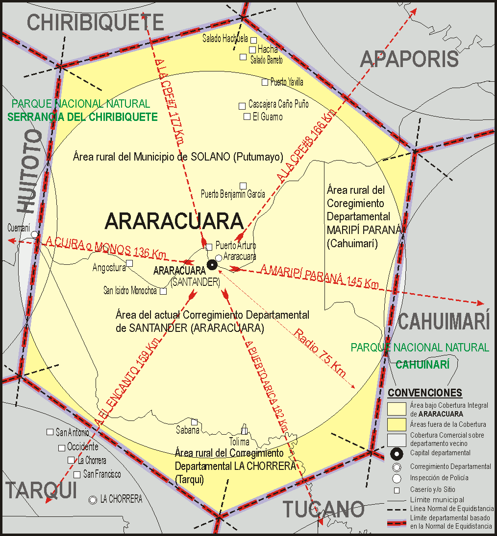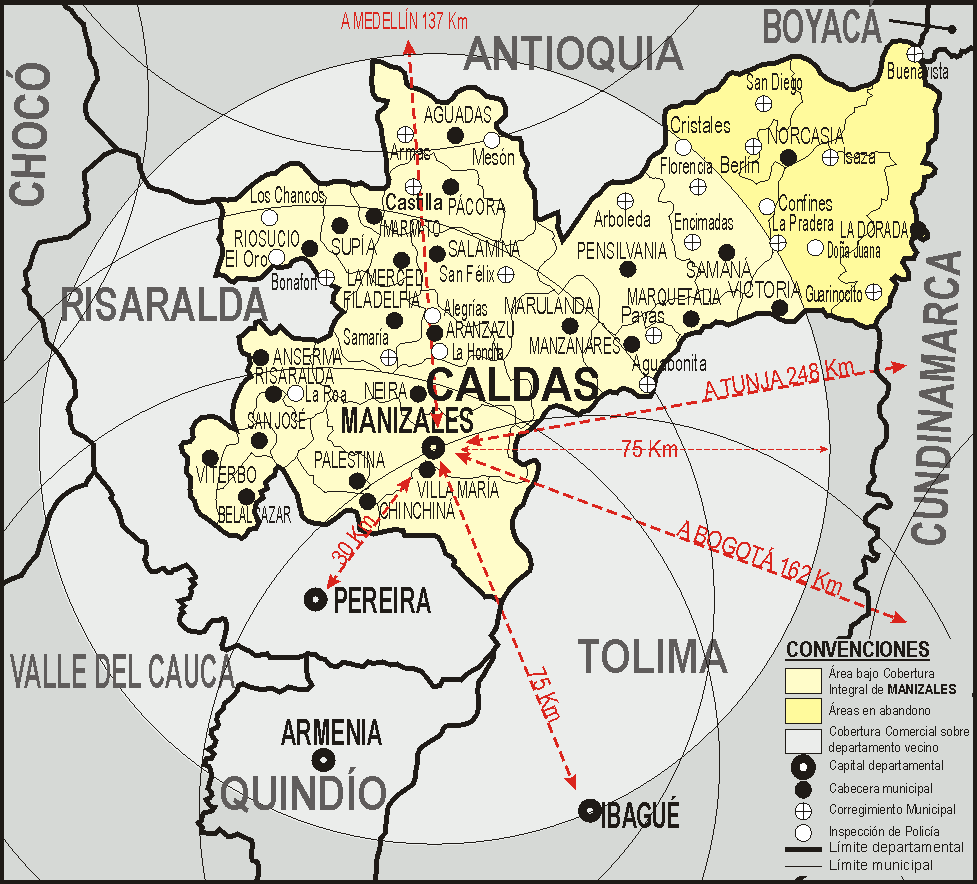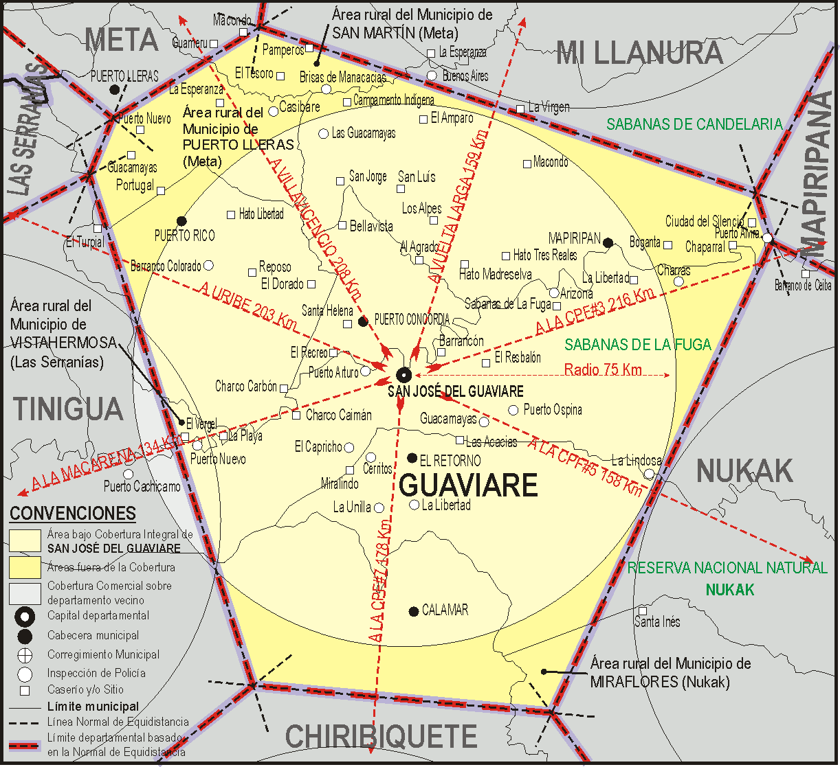 Perimetrales son tomadas desde 1.2 – Las Distancias intercapitales son tomadas en línea recta entre las capitales de los departamentos vecinos. Sirven para determinar las frecuencias de movimiento que permiten en función de su extensión. Este estudio se desarrolla para determinar las áreas resultantes al aplicar el concepto de Distancia Natural sobre los mapas de las Entidades Territoriales. 2.1 – El Área de cobertura de