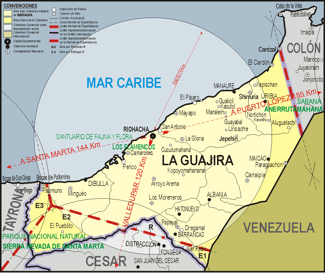 Distancia Natural de a). Propia o de Cobertura Administrativa, cuando recae sobre el área de la entidad territorial que le pertenece, y cuya consecuencia es que la atienden directa y eficazmente los organismos públicos y privados ubicados en la capital departamental; b). Externa o de Cobertura Comercial, si cae sobre áreas de entidades territoriales ajenas en cuyo caso sólo reciben influencia de carácter privado desde la capital que las cubre; c). Cobertura Marina, cuando la ubicación de la capital lo permite, ésta se extiende en función de los medios de transporte disponibles para el caso; y d). Cobertura Comercial Exterior, cuando recae sobre territorio de otra nación, caso en el cual sólo influye de manera privada en lo que permitan los convenios internacionales. 2.2 – La rotación de los